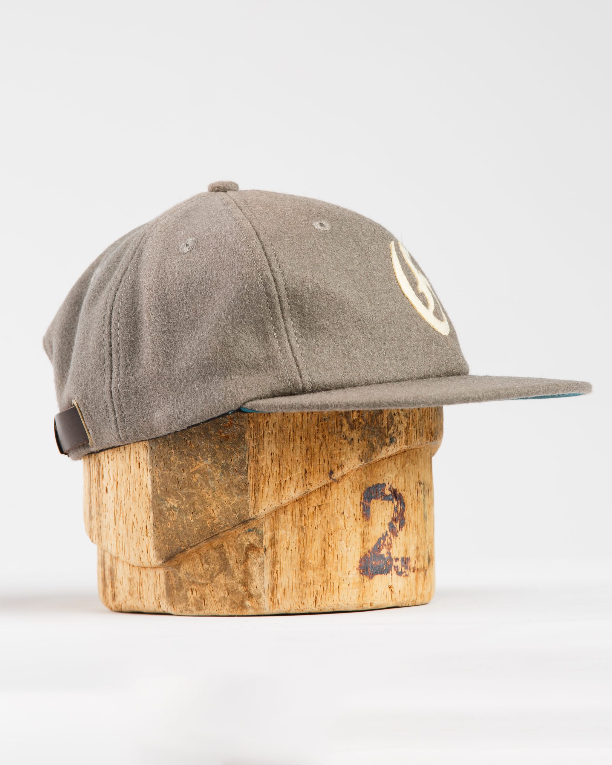 A classic Melton wool cap with a structured fit and short brim for a clean, timeless look. Finished with bold Old English lettering, a green satin underbrim, and an adjustable leather strap for a custom fit.